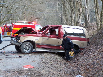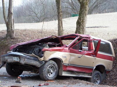 Bronco struck road bank to right, crashing