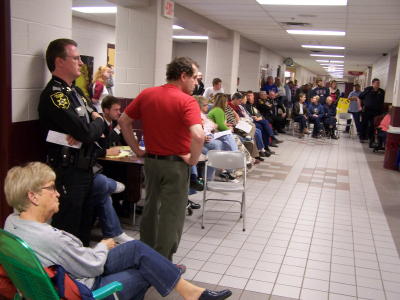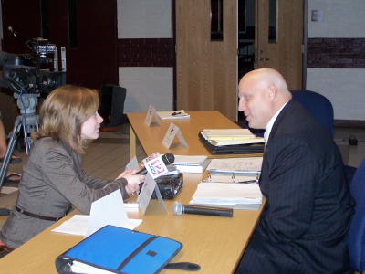 ![]() WBOY-TV reporter Susan Sullivan interviews Mr. Toman, who says "All my decisions have been what I believe is best for Gilmer County students" About 150 teachers, school personnel, and county residents attended the meeting at Gilmer County High School, with several of them signing up to speak to the board. Most Toman supporters were critical of board president Phyllis Starkey, calling for her resignation. One speaker accused Starkey of "blatant abuse - you should resign to save the county further embarrassment." Gilmer County Sheriff Mickey Metz and other officers attended the meeting because last month's session got loud and boisterous. Toman supporters, many of them school personnel and family members, wore Toman t-shirts to that meeting, protesting the board's action to table a motion to re-hire the superintendent. The WV School Board Association said Starkey and board members followed appropriate procedure. Board member Misty Pritt objected to the transcript of last month's meeting, saying it was difficult to hear official business, after which the board voted to amend the minutes.