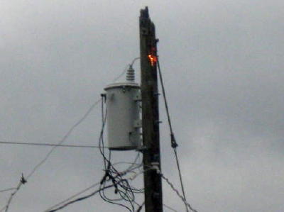 A pole fire on Pleasant Lane at Pleasant Hill late yesterday was caused by a squirrel, who managed to barbecue himself, before the Grantsville VFD arrived (Photo by Jennifer Hartz)