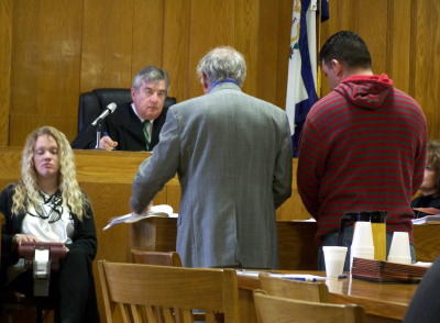 Attorney Tom Whittier and Christopher Todd Smith (right) By Bob Weaver Judge David Nibert rejected a plea agreement yesterday in Calhoun Circuit Court sought by Grantsville resident Christopher Todd Smith, indicating Smith has a long list of criminal charges in several counties. The action means Smith will stand trial, likely in June. Smith had pled guilty to "conspiracy to possess a controlled substance with intent to deliver with an unknown individual," after police said they discovered a gallon bag of marijuana in his residence in 2007. During that same incident, Smith was cleared of charges filed against him for allegedly shooting a BB gun at a Charleston Gazette newspaper carrier, indicating a problem with inconsistent testimony. Smith's attorney Tom Whittier said, "I ask your honor to accept this plea," after Whittier reviewed Smith's long criminal record, making corrections to court documents. Judge Nibert responded by saying "I've given this matter a lot of consideration about accepting this agreement, with Smith paying a fine and walking away." Nibert continued, Smith "Has an almost 20 year history [of crimes] and I'm not going to accept this agreement." Whittier objected to the presence of the Hur Herald in the courtroom related to taking photographs. Judge Nibert advised Whittier the court is a public forum and the Circuit Court allows photography with some limited exceptions. Whittier asked the court, "How many people do you know who have made such an effort [to reform]?", saying Smith has obtained 91 hours of college credit in criminal justice at Glenville State College. "When not going to school, he has been in business. He has tried to reform himself," Whittier said. "His glass is half-full, not half-empty ... His record is exceptional ... toward being a productive citizen." Smith has maintained he was not aware who owned the drug found in his residence. Speaking on his own behalf, Smith told Judge Nibert he didn't feel like he had done anything (wrong) that he was trying to get an education and better himself. Smith's plea agreement had said "That the defendant agrees to appear and truthfully testify as to all matters within his knowledge when summoned by any party in any criminal matter," among other conditions. The state had also agreed to dismiss any charges pending against Kelly Lawson, related to the case. Smith remains on bond until his trial. SMITH PLEADS GUILTY TO DRUG CHARGE WITH PLEA AGREEMENT