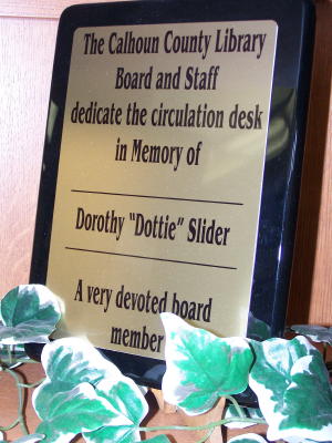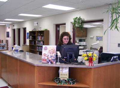 Librarian Amy Cooper behind roomy new Calhoun Library circulation desk, made possible through donations in memory of the late Dottie Slider, former board member