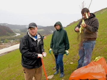 L-R Andrew Darby, Jill Haasch, and Cam Nicholas; Jill Haasch By Drew Moody Rain was steady throughout Tuesday morning as the Glenville State College Land Resources Department worked to complete the first phase of reclamation at Charleston's Yeager Airport. Portions of the 33-degree slope and surrounding areas have a stark, barren look not unlike a moon-scape. A 1,000-foot runway extension necessitated moving millions of tons of fill; creating a tear in the picturesque scenery along the interstate just north of downtown. A variety of trees were planted. Some were planted for the nuts they will someday create; others were for stabilization and to enhance attracting wildlife back to the area. Black locust and redbud seeds were hydro-seeded in other areas.