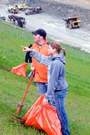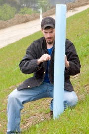 (L) Justin Nottingham ties up tree shelter. (R) Students Corey It was GSC's fourth trip to work at the site. Tree shelters were put on the red oak and Chinese chestnuts seedlings. The shelters act as both a miniature greenhouse for the seedlings and prevent deer from eating the young trees. "We're planning on coming back this fall and doing a count to see what's survived from this planting and also what has sprouted from the other seeds that's been hydro-seeded," said Rick Sypolt, land resources chairman. About 32 students including members of the Alpha Theta Zi sorority and their advisor, professor Jill Haasch, were among the tree planters. Glenville State College's land resources department teamed up with Yeager Airport last fall to help facilitate reclaiming the area. The initial focus of GSC's effort is 20-acres most visible from the interstate area.