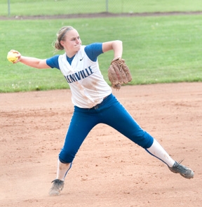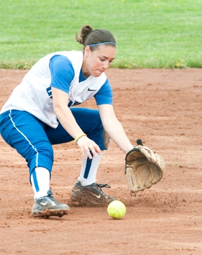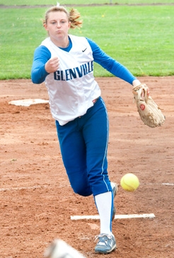 Morgan Elswick fires a throw to first On Thursday the Lady Pioneers defeated West Liberty 2-1(seeded 10th) and Fairmont 6-1 (seeded 2nd). GSC was seeded seventh entering the tournament. The Lady Pioneers committed no errors in either Thursday game. Mandy Parkulo pitched all but four innings of the day. Laura Childers pitched the first four innings against West Liberty. Fairmont scored a run in the top of the fifth taking the lead 1-0.