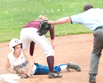 Karly Eskew is called safe at third after sliding The Lady Pioneers answered when freshman Lacey Williams came to the plate in the top of the sixth with two outs. The bases were loaded. Her base-clearing triple scored three runs. Leanne Harris (2B) has been a strong hitter during the series as well. And Karly Eskew's (SS) strength and speed has proved an invaluable asset in her base-stealing prowess. The best-ever winning conference and season records of the Lady Pioneers softball program were shattered Thursday and their WVIAC legacy has not been finalized for the 2009 season as yet. "They played hard, they played as a team," Coach Rick Moore said. "I'm proud of my kids."