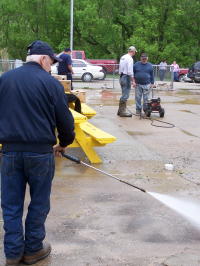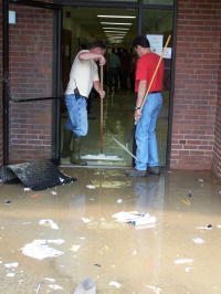 Outside crew cleans up debris. School personnel and volunteers lifted fixtures, equipment and supplies from the floor Monday with anticipation water would enter the building. Sand bags were placed around the outside entrances, according to principal Bryan Sterns. Water was about 6 inches deep in the structure.