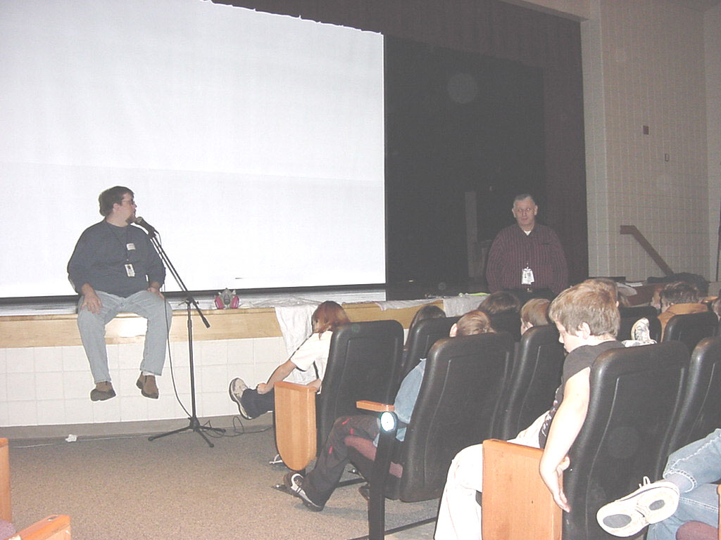 | Submitted by: Linda Jarvis Harry Drake, minister of Nobe First Baptist, and Bubby Ferguson, a member, shared their experiences with the cleanup after September 11 with fifth and six graders of Calhoun Middle School. A slide show brought students up close to the work taking place in New York City. These two men were part of a crew of Baptist men and women cleaning apartments of neighboring buildings. Their words, pictures, and display of items, made real the tragedies and effects that day has had on people's lives.