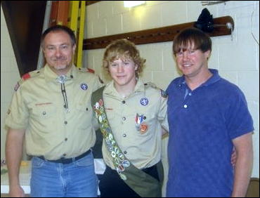 L to R: Randy Ball, Scout Leader, new Eagle Nick Stevens with his father Mark Stevens