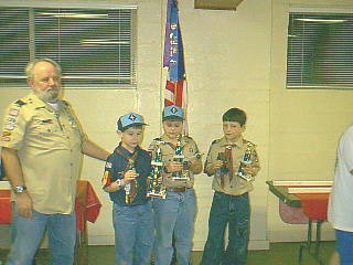 L to R: Paul Funk, Cub Master, 1st Place Eli Dye, 2nd Place, Ben Sims, 3rd Place, Brandon Reed