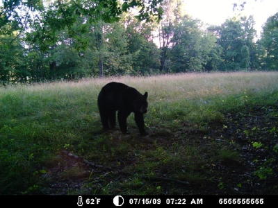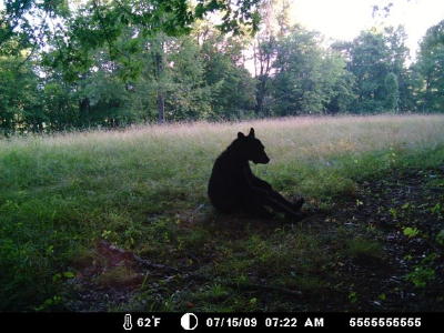 2009-Rick Falls' Millstone game camera caught this fine looking bear relaxing for the camera shoot, and later wandering around the field (Photos compliments Melissa Falls)