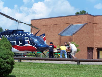![]() A 21-year-old male identified as Chadwick Lee Sochall of Kenna, the driver of an ATV, reportedly received head injuries when he was thrown from his four-wheeler on Leading Creek Rd., about two miles from State Rt. 16. He was riding in an ATV poker run benefit. The victim was flown to a regional hospital by Air-Evac from Wood County from a landing zone at Pleasant Hill Elementary School. The accident happened about 12:25 today, the victim reportedly thrown from his ATV after making a sudden stop to keep from hitting another ATV in front of him. Calhoun EMS and the Grantsville VFD responded to the scene. |