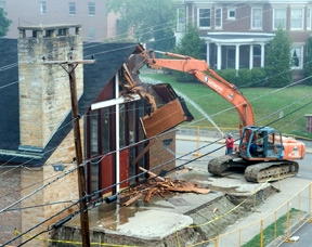 Rod Livengood, of Morgantown Excavators, Inc., Story and Photos by Drew Moody Demolition crews razed the former Wesleyan Foundation Tuesday morning in preparation for a new on-campus dormitory capable of housing nearly 500 students. Two other structures are being demolished during initial site preparation. Project deadlines are designed to complete roughly half the structure permitting occupancy while finishing the rest. By next August the first 220 residents are scheduled to move in. The remainder of the rooms will open in the spring of 2011.