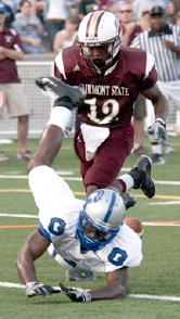 To score 21-points the Falcons had two plays from scrimmage, an interception, and a kick-off return. It took all of 69-seconds excluding the kick-off return. On GSC's first possession from scrimmage Ryland Newman netted an interception for Fairmont making a 39 yd return to score. Their third touchdown in the first quarter was a 73-yard kick-off return. All told Fairmont benefited from seven interceptions and three GSC fumbles. Glenville quarterback James McCants didn't start the game but netted 18-33 for 254 yards, one touchdown and five interception by games end. The Pioneers never gave up though, coming back from long odds and big leads twice during the contest. The GSC coaching staff was called for unsportsmanlike conduct during a midfield argument with officials near the end of the third quarter. GSC's Brian Harden (17) and DeAndre Johnson (13) led the Pioneers rushing effort with 115 and 121 yards respectively. Xavier Glenn (5) led the receivers with 120 yards in five receptions. He also netted 102 yards on four kick-off returns. James McDonald had 99 yards in 8 catches.