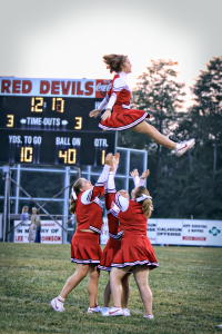 Red Devil Cheerleaders enthuse the crowd while Zach Moore After spotting PCHS a lead - on a pass to Cwynar - Calhoun bounced back to take the lead 7-6 on Darrenger Fluharty's scoring run. The difference was Moore hit the extra point for Calhoun while Demaio did not. After PCHS regained the lead on a short run by Brunoni Calhoun came right back on Metz' long run out of the power-I. It stood that way until Demaio's kick.
