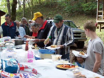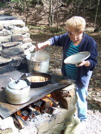 ![]() Charlie McKown opens session with Randall's "West Fork Valley Home" (left); Esther Laughlin, longtime Arnoldsburg school cook and maker of famous baked goods, just can't keep from cookin'