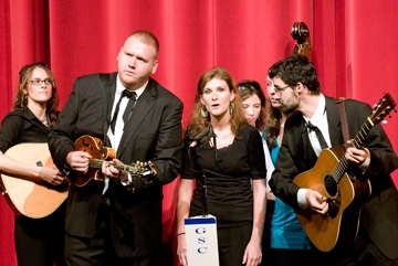The well-known GSC bluegrass band performs. With a traditional Story and photos by Drew Moody Glenville State College's Music Fest, Tuesday evening, packed the fine arts auditorium to near capacity. Attendance was enthusiastically bolstered by students from several middle and high schools from throughout the state. All nine of Glenville's music divisions were featured including: the jazz band, chamber singers, brass ensemble, concert choir, percussion ensemble, woodwind ensemble, the bluegrass band and the GSC Pioneer marching band. Each group performed two numbers.