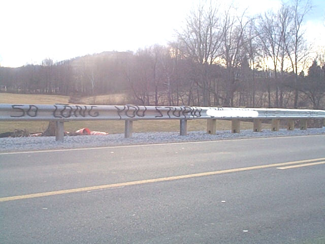 ![]() Bridge, road and approaches covered with multiple messages The new Elizabeth bridge across the Little Kanawha River on Route 5 was vandalized from one end to the other this week, including the approaches, roadway, guardrails and walls, mostly with profane graffiti naming local law enforcement officials and generally attacking citizens of Elizabeth. The State Department of Highways said the damage was considerable, linked to the cost of removing the painted messages.