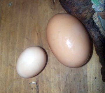 2009 - Jason Peck of Russett found a very unusual sized egg in his chicken coup yesterday, the smaller egg shown is average size