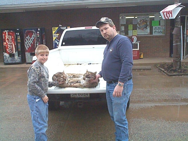 Daniel (left) and Joe McFee (right) display their bobcats Just in case you have forgotten, we do live in the backwoods. Neighboring Wirt residents Daniel and Joe McFee trapped two bobcats on Courtney Ridge, weighing 28 and 30 pounds. Lots of other folks have been hunting the animals, some in our favorite wilderness area Bear Fork. Hur resident Harold Sturms got a couple last year, not uncommon for him. Over 40 years ago Ron Lynch and I sent chills up our spines listening to the bobcats below the ill-fated Village of Richardson. The West Fork of the Little Kanawha cuts through the hills, with rocky ledges and cliffs along the river, and it was here in the late night darkness the critters would scream and howl. Here are some critter facts for the several thousand Herald readers, who live mostly in urban areas around America. While we do have our share of varmints in these here woods, it is rare they cause problems. A few months ago when Dianne and I got up at 3 a.m. to observe the Leonid meteors bombarding the earth, our dog Sox had a short stand-off with a bear below our house near the garden. Despite Sox barking and howling, protecting the home-turf, the black bear seemed unconcerned and slowly ambled into the woods. It was our third bear sighting in downtown Hur, but they frequently come close to the house on hot summer nights and waller the brush, very skittish and fearful of human beings. I have spotted several in the past five years while ridge-running. Out on "The Husk" they trample the winter grass deep into the mud around our favorite persimmon tree. Then we have the coyotes, transplanted into the area by DNR officials, or so the local folk report. Listening to these critters down along the Little Kanawha will pump a little adrenaline. Once in a while we'll see one cross the highway, or some local folks will report they have killed one. Then, hold your breath, there is the constant flow of tales about really big cats in the area. Yes, we mean mountain lions. Some folks swear to it. |