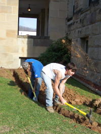 ![]() Poles and new lights are being erected around the county courthouse, while Frank Hardman and Josh Boswell dig ditch for the electric supply, the security lighting was obtained by a grant through the Calhoun Commission, Rick Alderman contractor |