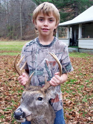 Youngster Chris Johnson, age 8, displays this deer killed yesterday