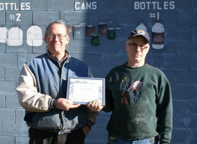 Tom Degen (left) Executive Director CCSWA presents Stephen For the past four years, the Calhoun County Solid Waste Authority has chosen a recycling champion to coincide with America Recycles Day, held each November. Calhoun's 2009 recycling champion is Cain Farms of Big Bend, WV, operated by Francis and Donna Cain. Cain Farms brings all of its paper feed bags from its large cattle operation to Cabot Recycling Station for recycling. By recycling its feedbags, Cain Farms is helping fight climate change, avoiding costly disposal fees, and conserving resources. Every ton of paper recycled saves 17 trees and 7,000 gallons of water. The executive director of the Calhoun County Solid Waste Authority presented the 2009 Recycling Champion Award to Stephen Beecher of Cain Farms on November 13 at Cabot Recycling Station. As part of acknowledging Cain Farms' significant recycling leadership, the Calhoun County Solid Waste Authority would like to point out that we all benefit from their efforts, which provide for a better tomorrow. Cabot Recycling Station is open to accept recyclables 24 hours a day, seven days a week. Nonferrous metals are purchased on Tuesday, Thursday, and Saturday. Call 304-354-7786 for more information.