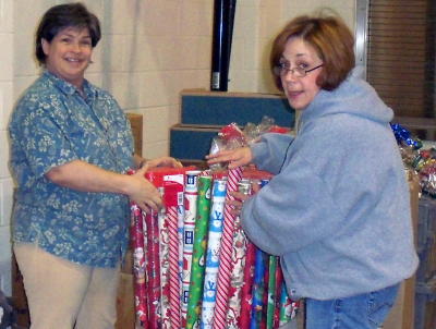 Donna Richards (left) and Marie Wilson count wrapping paper