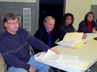 DIGGING OUT (L to R) board member Roscoe Gainer, By Bob Weaver Attorney Tom Whitter advised the Mt. Zion PSD board Monday evening, "If questions don't get answered (by the WV Public Service Commission) the PSD could go into receivership." PSD board members went through an agenda that covered a myriad of problems, from current litigation that appears to have brought the $5.2 million water project to a standstill, to trying to wade through a list of financial problems. Board member Roscoe Gainer called the agenda "challenging." The board has paid some current operational bills, and has made an agreement with the Town of Grantsville to make payments on purchased water. Attorney Whitter recommended the PSC look to the WV Public Service Commission for help to review the problems for a possible rate increase, calling it a hardship situation. "The more we dig into the numbers, the more questions we have," Whitter said. "The district is unable to pay employees or make repairs," said board member Shirley Mace, "Some people say they haven't received a bill since last July." However, volunteer Norma Collins, said the billing is getting back to speed, although there have been some problems related to the winter weather. "We're trying to correct meter reading problems that seem to go back for several years," Mace said. Dick Ullum and Tom Fluharty, who have been working without pay, said a number of leaks and problems have been corrected with the resources available. Since the PSD's credit is thin and cash reserves are low, Ullum has been placing some needed items on his personal credit card. Board members Postalwait, Gainer and Mace participated in discussions on how to straighten-out the financial problems, hearing a report regarding the investigation by the WV Public Service requested by the Calhoun Commission. The board's CPA has resigned, unable to complete the 2007-08 audits because of unavailable records. There is a problem with missing minutes or where the Mt. Zion PSD board had not approved minutes of meetings. Board attorney Whittier indicated he would like for the board's former CPA to re-consider her resignation, since progress is being made. Representatives of the Mid-Ohio Valley Regional Council gave a report on plans to upgrade the sewer treatment plant and PSD systems, initial steps toward approving a company to move that work ahead. Attorney Whittier reviewed pending litigation regarding bid interference against project engineer Jim Hildreth, the suit is also filed against the Mt. Zion PSD. A hearing is set for January 22 for several matters. Whittier indicated attorney Rodaker will make a motion to dismiss the complaint filed by Ron Lane, Inc.