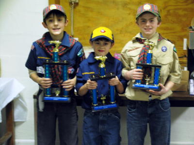 Derby winners (L-R) Jacob Butler, 1st place; Cub Scout Pack 436 recently finished their annual popcorn sales fundraiser. All boys participated and the group finished up as the 2nd place pack in the Little Kanawha District with over $4,500 in sales. The top three salesmen for Pack 436, earning $25, $15 and $10 rewards respectively, were, Houston Bennett, 1st; Alec Richards, 2nd; and Eli Stump, 3rd. Houston Bennett, son of J.R. and Amy Bennett, was also the top Little Kanawha District seller for the 2nd year in a row. He received extra rewards including a $50 gift certificate to Walmart and a trophy.