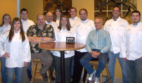 ![]() Cast Iron Cook-off team Café Cimino: (L-R) Carrie Harpold, Brandi Phillips, Sean Harris, GSC Dean of Student Affairs Jerry Burkhammer, chef Tim Urbanic of Café Cimino, Alyssa Fehrenbach, Kindra Davis-Kidd, Josh Tallman, Andy Ferraro, team sponsor Jerry Behney of Quality Products, chef Eli Urbanic of Café Cimino, James Coleman.