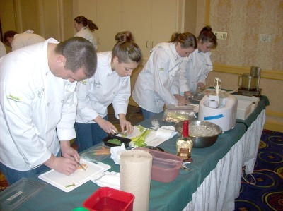 Submitted by Bob Edwards GLENVILLE, WV - The 5th Annual Cast Iron Cook-Off was held at the Charleston Marriott on Friday, January 15 and Saturday, January 16th. The event is sponsored by the Collaborative for 21st Century Appalachia, a nonprofit organization designed to connect West Virginia farmers with top chefs in the region and encourage them to use West Virginia products in their restaurants. The 2010 Cast Iron Cook-Off consisted of eleven teams of ten people who prepared exquisite four-course meals using locally produced ingredients all to be judged by a discriminating panel of culinary celebrities. Participants included teams representing: Café Cimino, The White Water Grill, Berry Hills Country Club, The Greenbrier, Bridge Road Bistro, The Hillbrook Inn, Smokey's on the Gorge, Stonewall Resort, Pierpont Culinary Academy, Estate Planning, and Provence Market. Ten student volunteers from Glenville State College joined forces with father and son chefs Tim and Eli Urbanic of the award winning Café Cimino Country Inn of Sutton, West Virginia, to from the Café Cimino team. GSC team members included sophomore Sean Harris of Flemington WV, senior Andy Ferraro of Avondale PA, junior Joshua Tallman of Elkins WV, sophomore James Coleman of Talcott WV, sophomore Brandi Phillips of Daniels WV, senior Carrie Harpold of Clarksburg WV, senior Kindra Davis-Kidd of Parkersburg WV, and junior Alyssa Fehrenbach of Elkins. GSC Dean of Student Affairs Jerry Burkhammer acted as the students' chaperone for the weekend. The students were sponsored by Jerry Behney of Quality Products, suppliers of dorm furnishings. Teams attended a reception on Friday evening where they were presented an authentic Cast Iron Cook-Off chef's coat, chef's cap, and apron. On Saturday morning, each team prepared their menu for the judges during a staggered one-hour time slot. A reception and dinner were held on Saturday evening when the awards were presented for the Cast Iron Cook-Off.