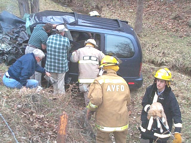 Van lands near creek after collision with truck A Chloe, Calhoun County woman was killed about 5:30 p.m. Sunday in a head-on collision at Leatherbark on U.S. 33-119, west of Liberty Hill. Dead is Virginia Pauline Osterhoudt, 48, formerly of Roane County. The deceased woman's husband Douglas, was life-flighted by HealthNet to Charleston Area Medical Center were he was described in serious condition. A neighbor heard the crash and saw flames coming from the Osterhoudt van, which landed near a creek bed. Virginia Mylott took a fire extinguisher and neighbors put out the blaze. Both vehicles were totaled. The couple's young granddaughter was taken to Roane General Hospital by Calhoun EMS, and was later transferred to CAMC. The Osterhoudt's van collided with a pick-up truck, reportedly driven by a Braxton County man. He was taken to Roane General, where a hospital spokesperson described his condition as serious. They said he was being transferred to CAMC for further treatment. Members of the Arnoldsburg Volunteer Fire Department and Calhoun EMS used extraction devices to remove the victims, although the small girl was pulled from the van. Two dogs were also in the van, one was injured.