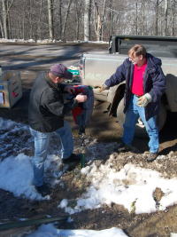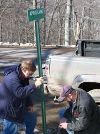 Calhoun's E-911 addressing and mapping coordinator Gary Buchanan (in red) and Walter McCartney erecting a road sign on Pleasant Hill, one of many signs being erected on newly named roads through the addressing and mapping project
