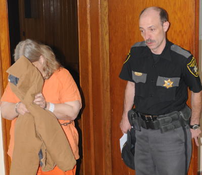 Jackie Denmark, hiding behind a coat, is escorted from the (Photo by David) Hedges