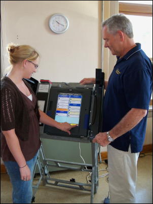 County Clerk Richard Kirby and Amanda Oldham calibrate