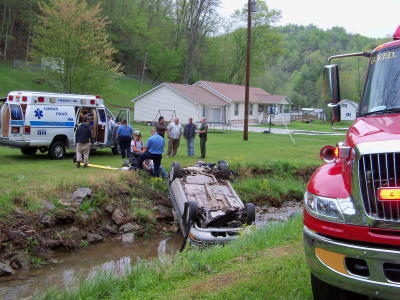 Anthony Ballengee received minor injuries, not requiring a trip to the hospital, when this vehicle landed in Phillips Run, south of Grantsville this morning