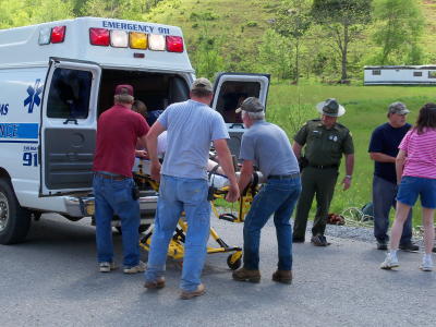 Responders load Rocky Dicky in ambulance, after which Rocky Dickey, about 54, who received injuries in the crash and was life-flighted to Charleston Area Medical Center, was listed in satisfactory condition Wednesday night. The ATV was traveling on Nicut Road and made a turn past the old Nicut Post Office, the driver apparently lost control and crashed into the creek. First responders said the woman was rescued from the creek. Wildman's body has been sent to the WV medical Examiners Office in Charleston.