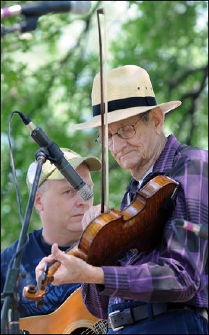 Lester McCumbers, 88, of Calhoun County, plays the fiddle with his son, Tim, on the guitar, during the senior fiddle contest Saturday at the Vandalia Gathering