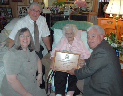 ![]() Josephine Kiess Blackwood, GSC's Oldest Living Graduate, is presented with a plaque at her 105th birthday celebration on Wednesday, July 21st. Pictured left to right: GSC Alumni Director Debbie Nagy, GSC Alumni Association President Bill Deel, Josephine Kiess Blackwood, and GSC Vice President for College Advancement Dennis Pounds.