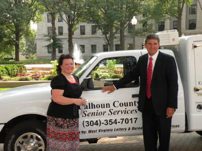 Brenda McBride, Assistant Director of Calhoun County Twenty new hot-cold meal delivery trucks will be on the roads of West Virginia providing meals to senior citizens in year three of funding to establish trucks throughout the state. With these additional trucks, seniors in all fifty-five counties will now have access to important meal delivery services. The trucks were purchased through grants from the West Virginia Bureau of Senior Services as part of an ongoing effort to increase services to seniors in their own homes and communities. Governor Joe Manchin and Commissioner Sandra Vanin presented the keys to these trucks to the county aging providers on August 5 at the State Capitol. The hot-cold meal delivery trucks will be serving seniors in Berkeley, Doddridge (Bi-County Nutrition), Boone, Brooke, Calhoun, Hampshire, Lewis, Mason, Monroe, Ohio, Pendleton, Preston, Putnam, Kanawha, Randolph, Tucker, Tyler, Webster, Wirt and Wyoming counties.