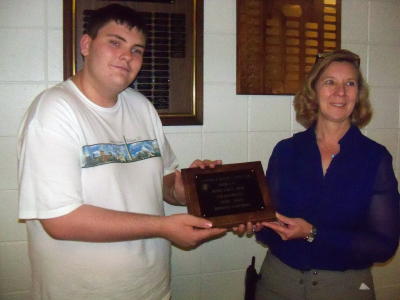 ![]() Calhoun Middle School 8th grader Kenny Dawson is being recognized for his spelling bee accomplishments in the 2009-10 RESA 5 Spelling Competition, above he is presented a plaque by Principal Karen Kirby