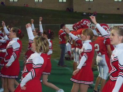 Cheerleaders rev up the fans Then Ben Laughlin banged one in from 11 yards out to make things 31-12. A come-from-behind victory for Calhoun was still a real long shot, but it was doable. It was made less doable by a 53-yard gallop by Doddridge quarterback Cory Aichele but when Bronson Clark answered moments later with an 11-yard scoring run for the Red Devils to make it 38-20 it made the impossible seem possible. Not probable, but possible. But that's where the Red Devils' hoped for fairy tale ending ended. Calhoun would not score again and Doddridge would apply the final nail in the coffin when Justin Hefflin scored his third touchdown of the evening setting the final score.