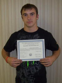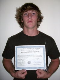 ![]() Camden Kinder (left) completed his plate certification the last part of the Spring 2010 year and Aaron Dawson Jarvis (right) was the first student of the Fall school year to receive his plate certificate in stick welding. "It takes a lot of hard work and dedication to pass this test and I am very proud of their efforts," says Carl Collins, Welding Technology Instructor at Calhoun-Gilmer Career Center.