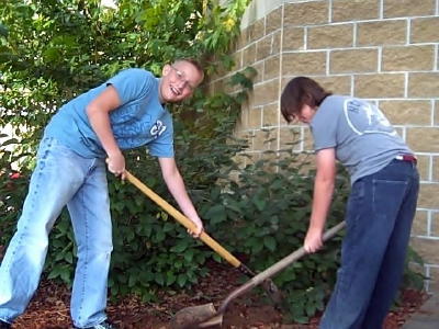 ![]() Allen Metheny (L) and Conner Ritchie prepare flower beds