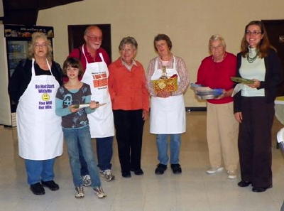 ![]() Fruit pie division winners (front) Sophia Steigleder; (Back L-R) judges, Dawson, Weaver and Morris; Gloria Stevens, Donna Cain and Tami Allen Susan Carper took 1st place in the cream pie division for her peanut butter pie; Debbie King won 2nd place with apple cheese cake; and Kristen Garrett tied with herself for 3rd place with her pumpkin and peanut butter pie entries.