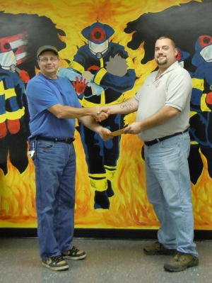Larry Wade of Dominion Natural Gas (left) presents a check to Dominion Natural Gas recently donated $350.00 to the Grantsville Volunteer Fire Department for a well-needed copy machine. Jim Bennett and Calhoun Banks have also donated $1,000.00 toward safety equipment. "The department thanks Dominion and Calhoun Banks. We also want to say thanks for donations we received during our recent portrait drive," said Chief Gherke. |
