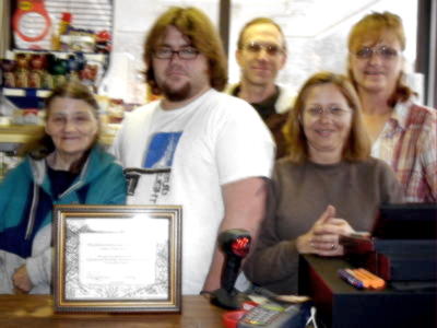 Article and photo by Tom Degen, For the past five years, the Calhoun County Solid Waste Authority has chosen a recycling champion to coincide with America Recycles Day, on November 15. Calhoun's recycling champion this year is Cha Tis of Grantsville, WV, a gas station and convenience store owned by Steve Satterfield. The entire staff at Cha Tis participates in bringing all of its cardboard to Cabot Recycling Station for recycling. By recycling its cardboard, Cha Tis is helping fight climate change, avoiding costly disposal fees, and conserving resources. Cha Tis also accepts used plastic bags such as those from Foodland or WalMart to re-use as plastic bags. This innovative program reduces litter, saves Cha Tis from buying new plastic bags and gives area residents a place to take their old plastic bags. Judy Wolfram, vice chair of the Calhoun County Solid Waste Authority presented the 2010 Recycling Champion Award to Cha Tis on November 19th. As part of acknowledging Cha Tis' significant recycling leadership, the Calhoun County Solid Waste Authority would like to point out that we all benefit from their efforts, which provide for a better tomorrow. Cabot Recycling Station is open to accept recyclables 24 hours a day, seven days a week. Nonferrous metals are purchased on Tuesday, Thursday, and Saturday. Call 304-354-7786 for more information.
