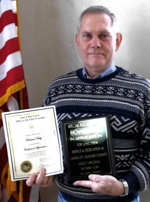 Retiring County Clerk Richard Kirby is Retiring Calhoun County Clerk Richard Kirby received recognition yesterday for his public service to the county. Acting Governor Earl Ray Tomblin presented Kirby with a certificate and the Calhoun Commission presented him with a plaque for his long-term service. Kirby has been the county's clerk for 20 years, and earlier served as a county commissioner for four years, appointed to an unexpired term. Previously he was the county's road supervisor for five years. He has been a licensed surveyor for over 30 years. Kirby said,"The people of the county have been really good to me, and I will always appreciate them." "I plan to part-time farm, part-time survey, and be a part-time babysitter," he concluded.