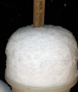 Snow is nine inches deep on the deck of the corporate offices of the Hur Herald, a report from Meadow Run says they have ten inches