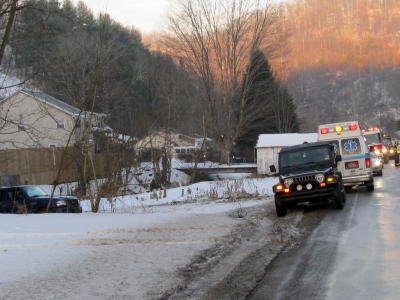 Truck (far left) almost went into A pick-up truck with an 18-year-old driver was a victim of black ice about 7:30 a.m. Tuesday on Rt. 16 south of Grantsville on Philip's Run. The driver was reportedly taken to Minnie Hamilton Health System for evaluation. Several stretches of Rt. 16 were covered with black ice with the temperature hovering at the freezing point. The Calhoun DOH reportedly ran out of salt last week, and is working on obtaining a new supply. |